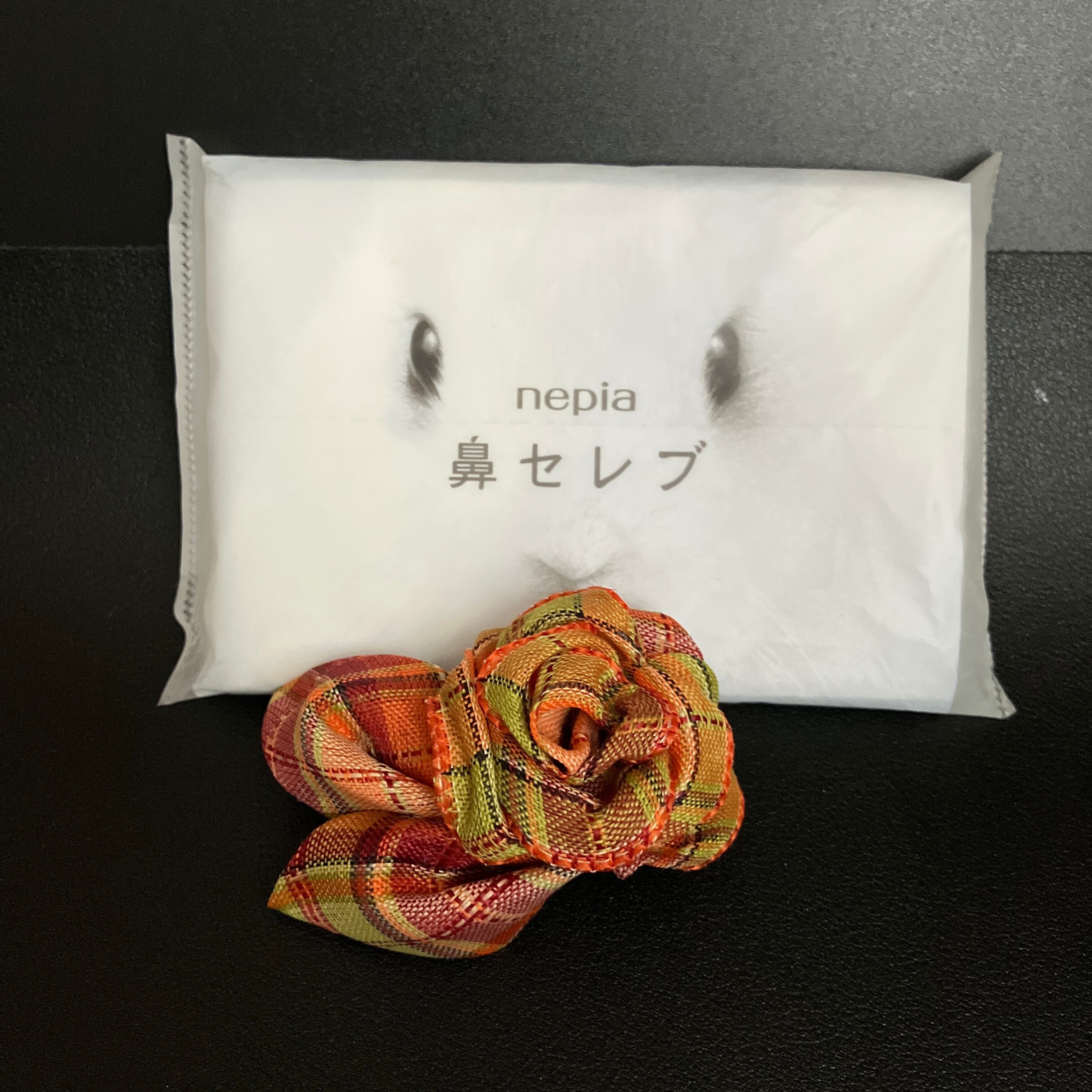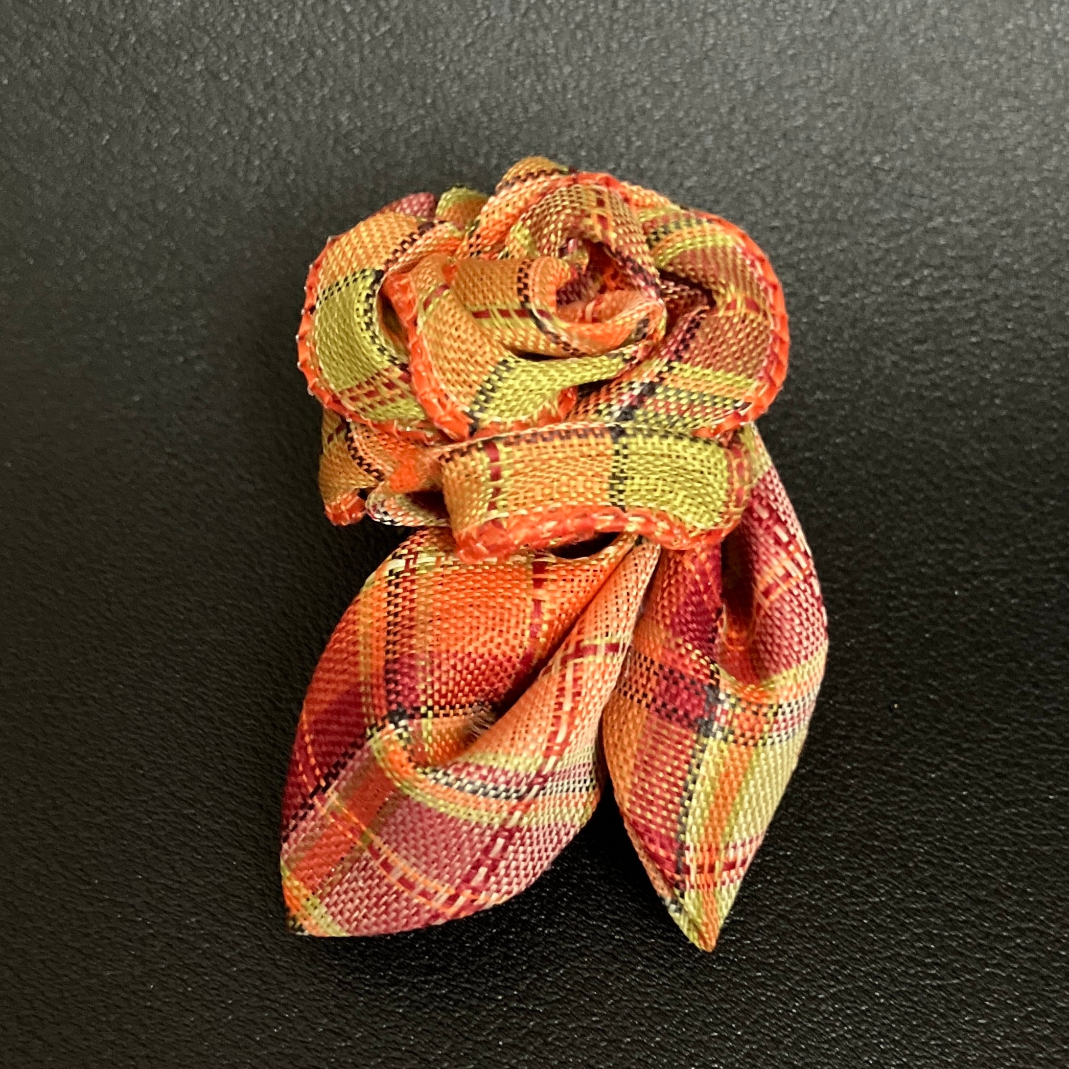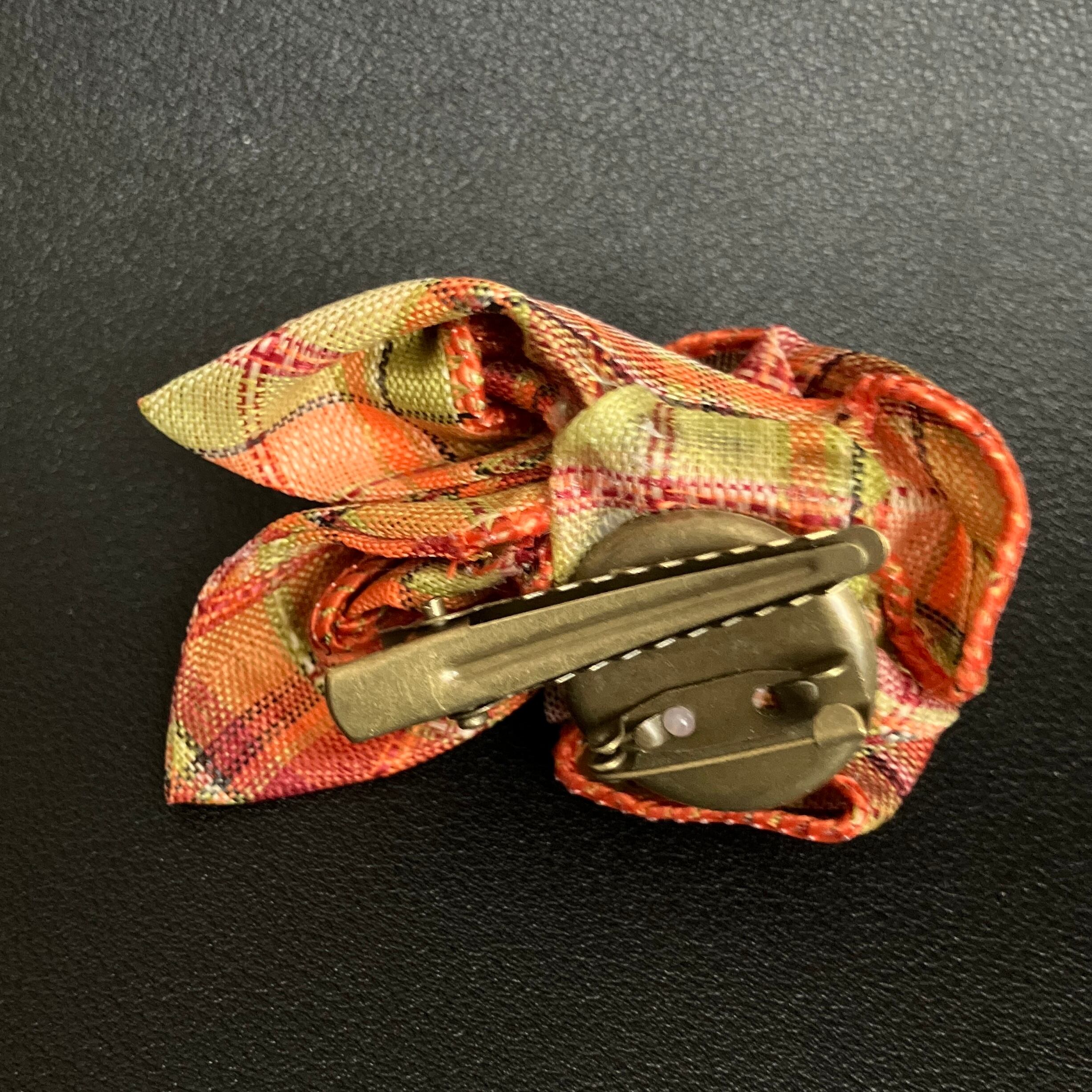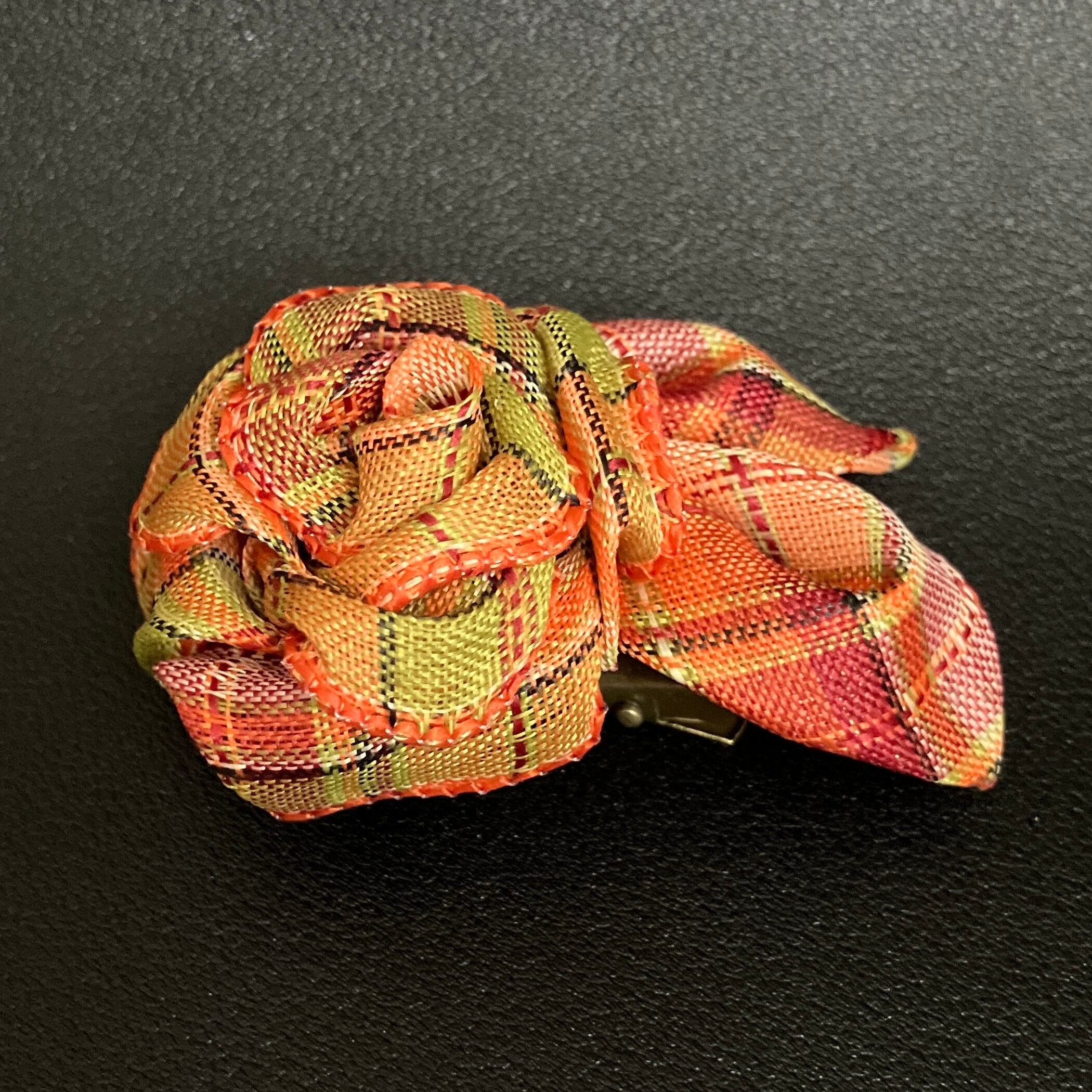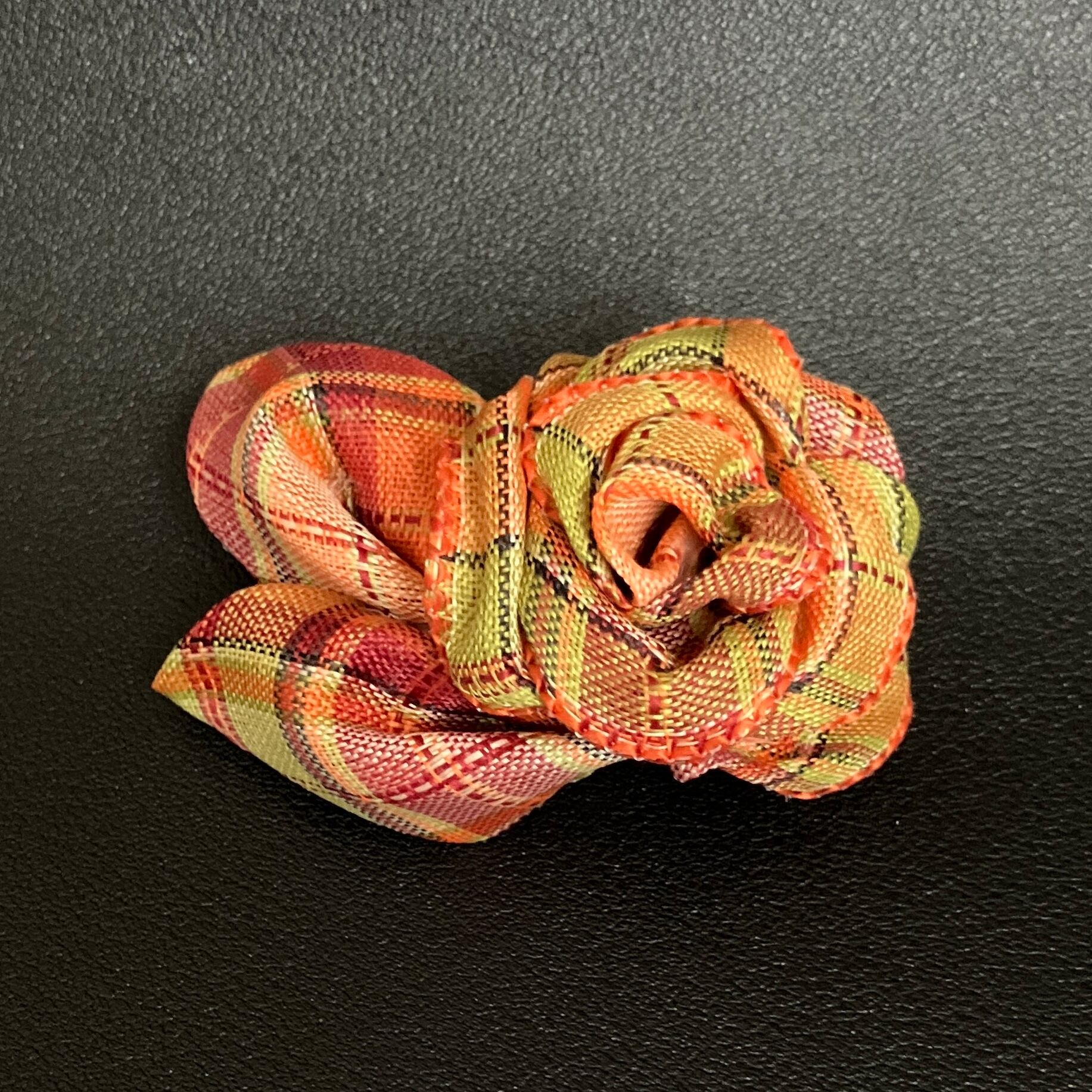■あたたかみのあるチェック柄を、丁寧に折り上げて花びらに仕立てたプチコサージュ。