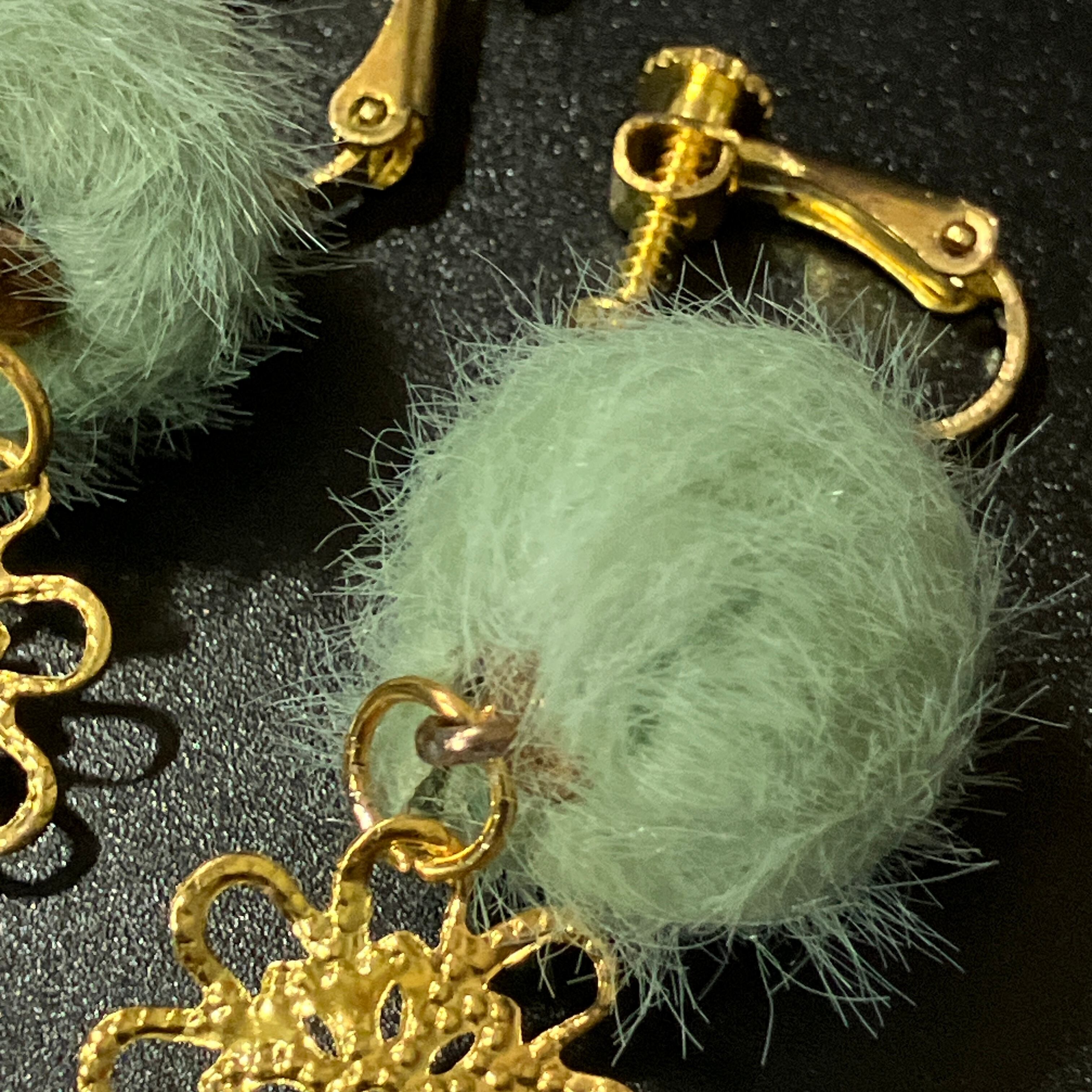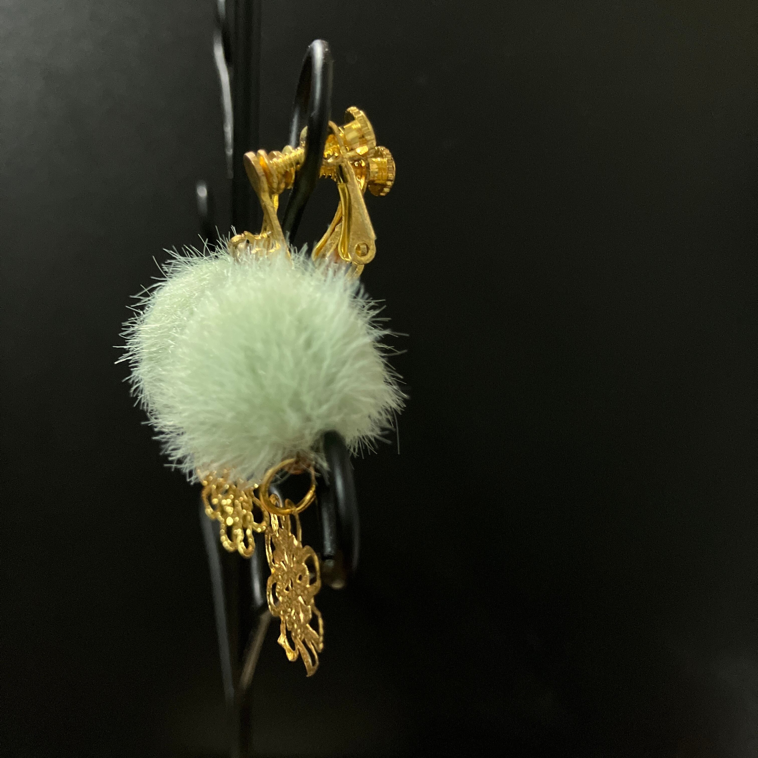 【ファーイヤリング】ミントグリーン × ゴールドモチーフ