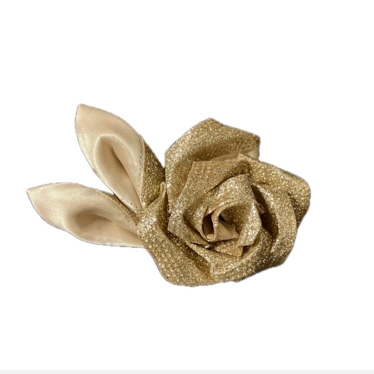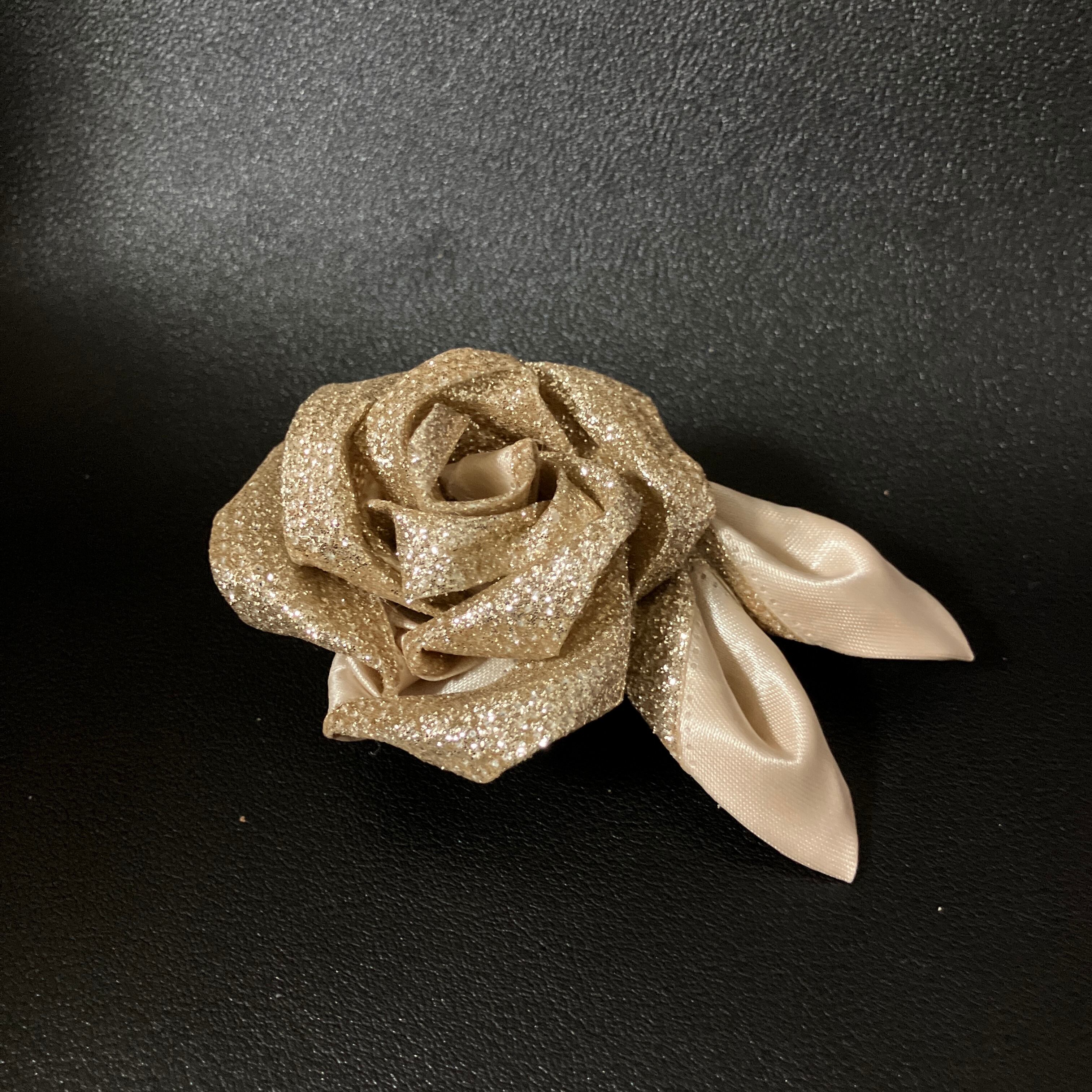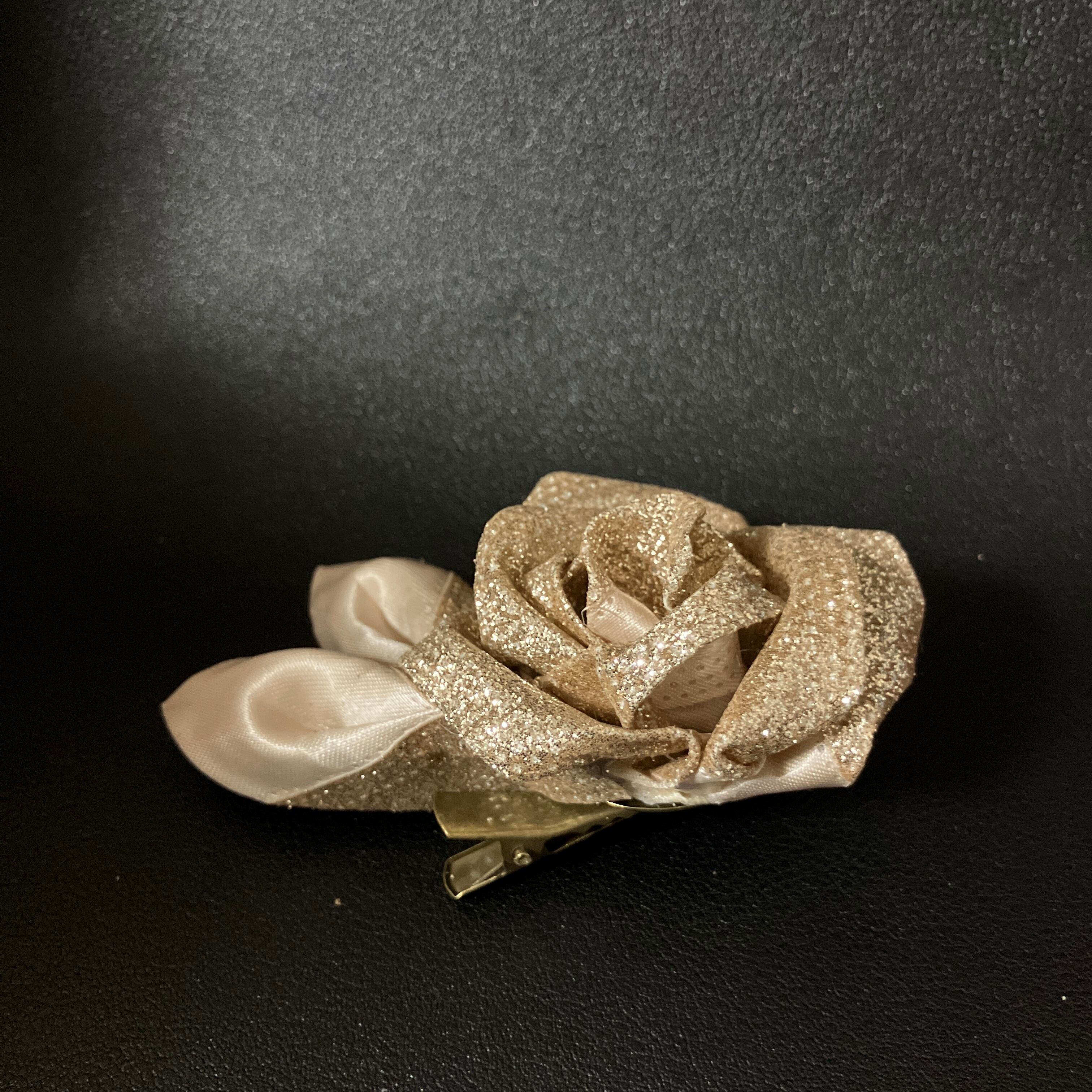 ■やわらかな曲線で咲くローズを、上品なゴールドラメのリボンで仕立てたプチコサージュ。