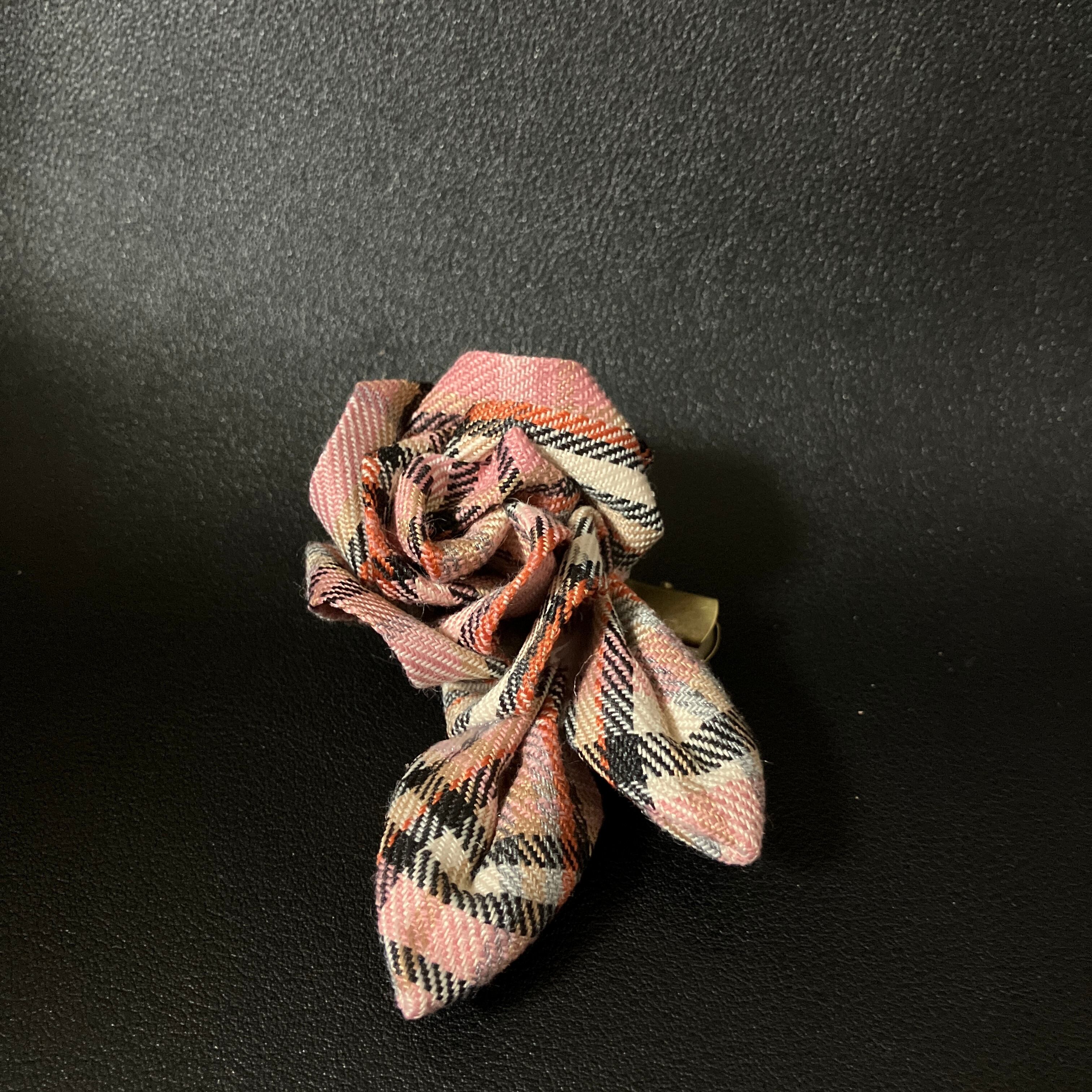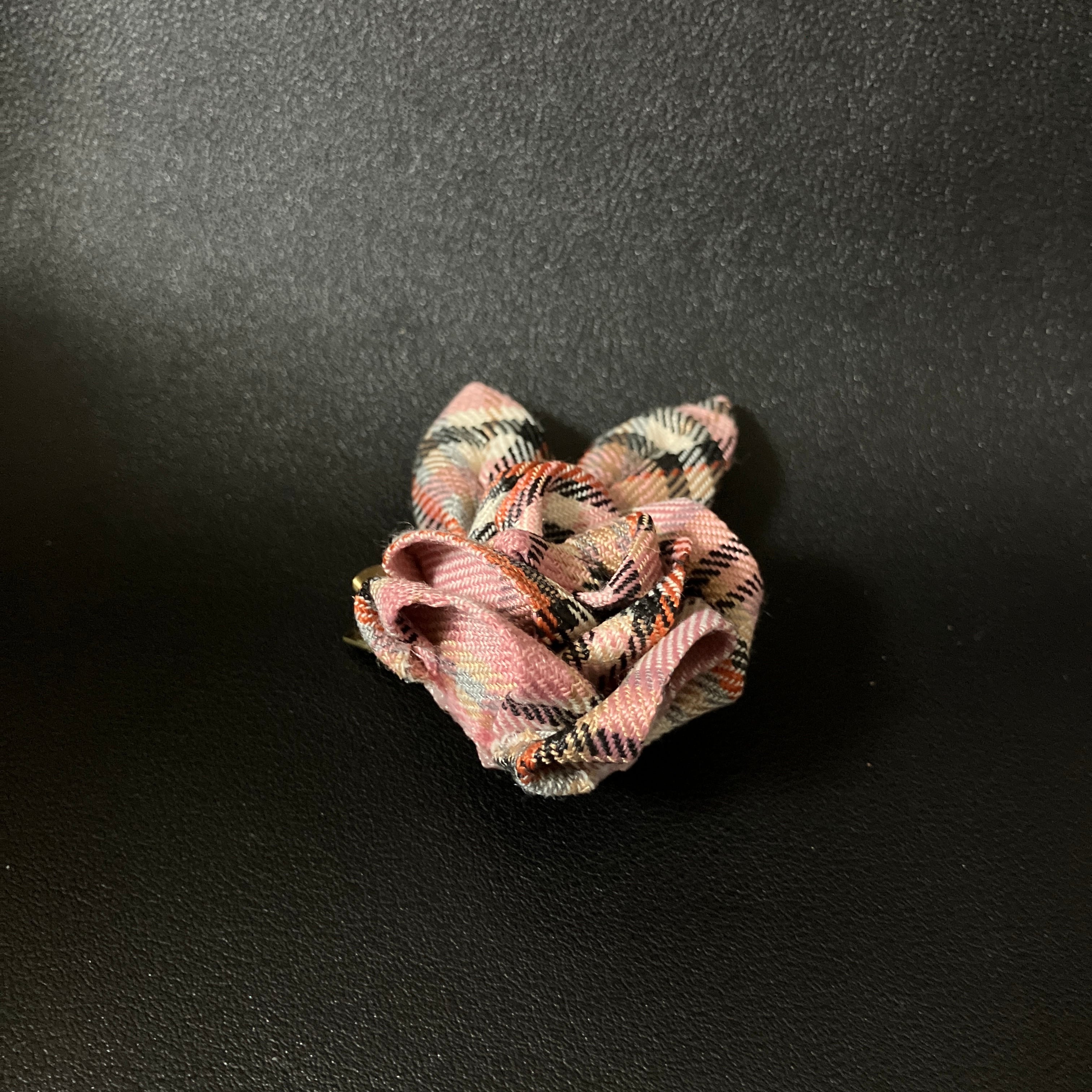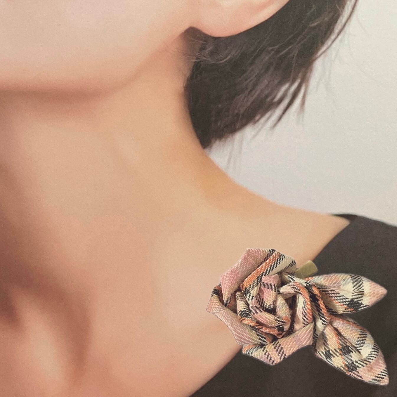 ■トラッドなチェック柄に、優しさと温もりを添えたリボンフラワーのプチコサージュです。