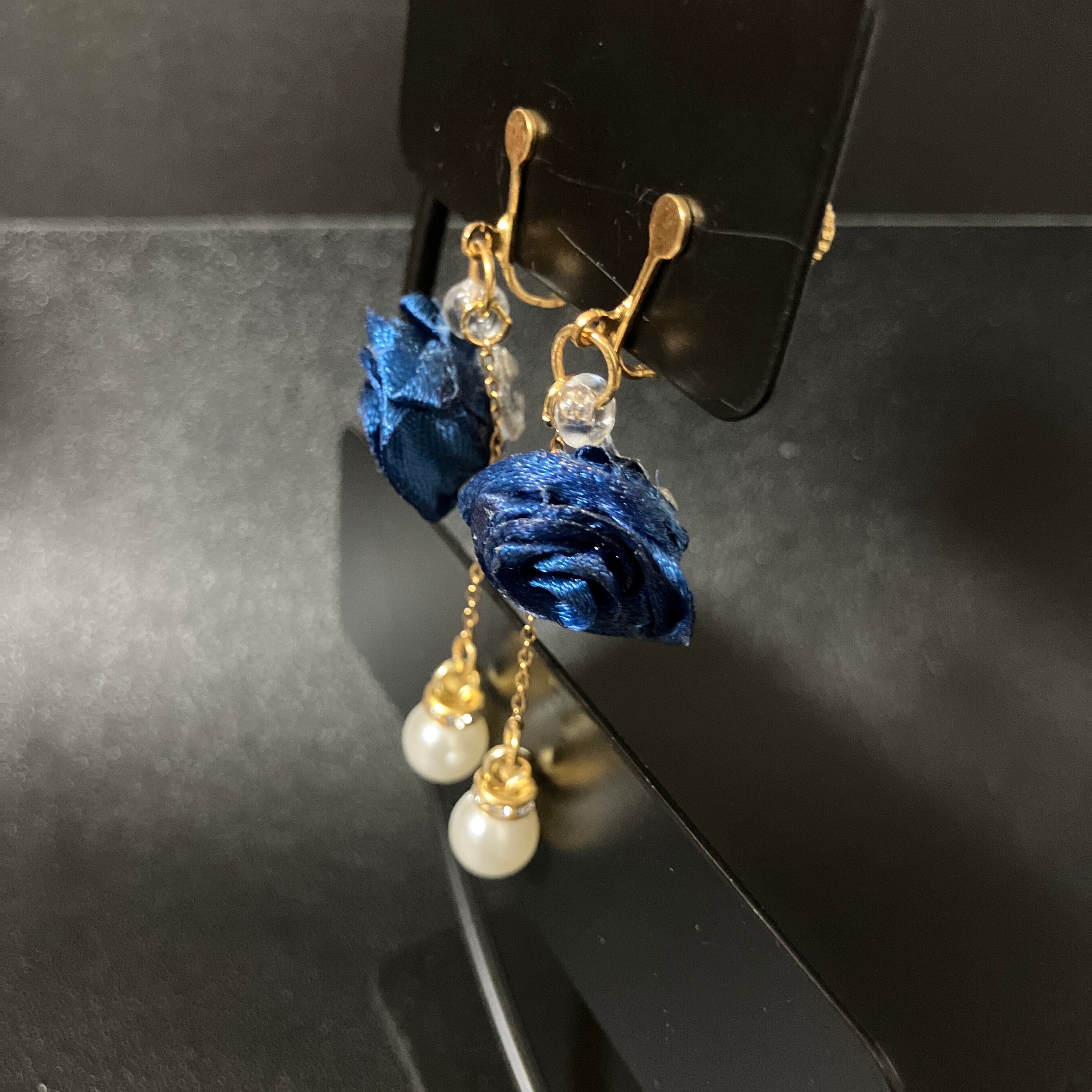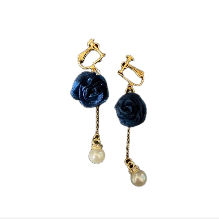 【イヤリング(ピアス)】サテンローズ:ノーブルネイビー×ドロップパール:ゴールド