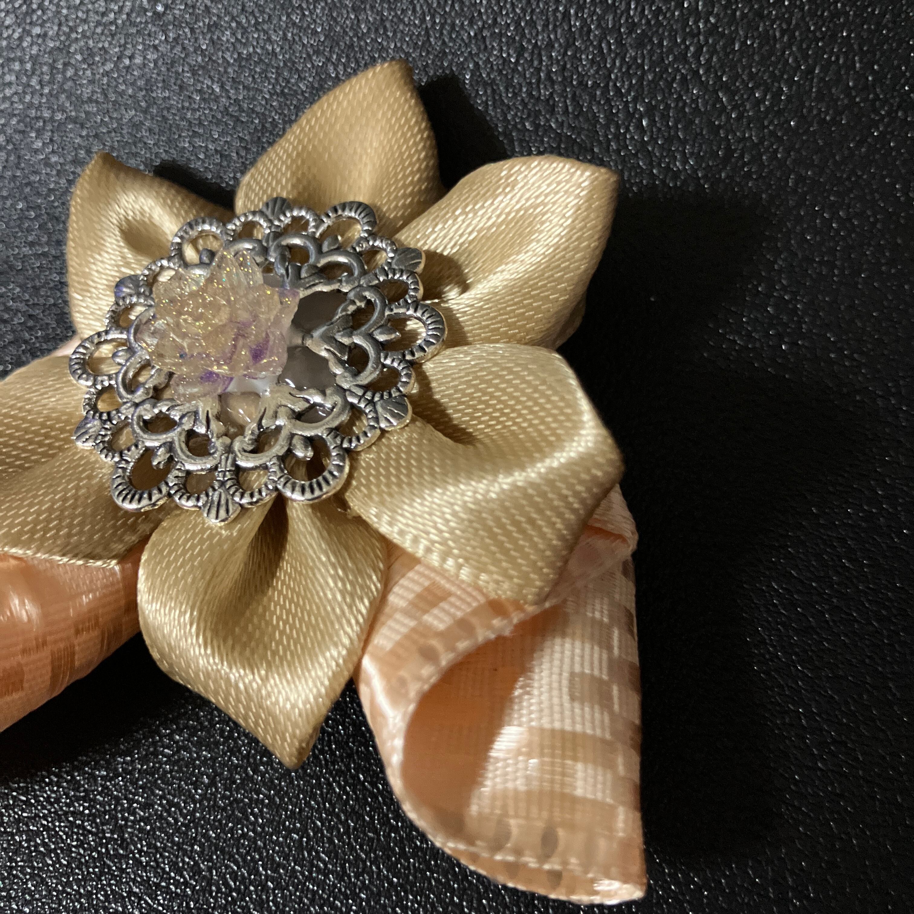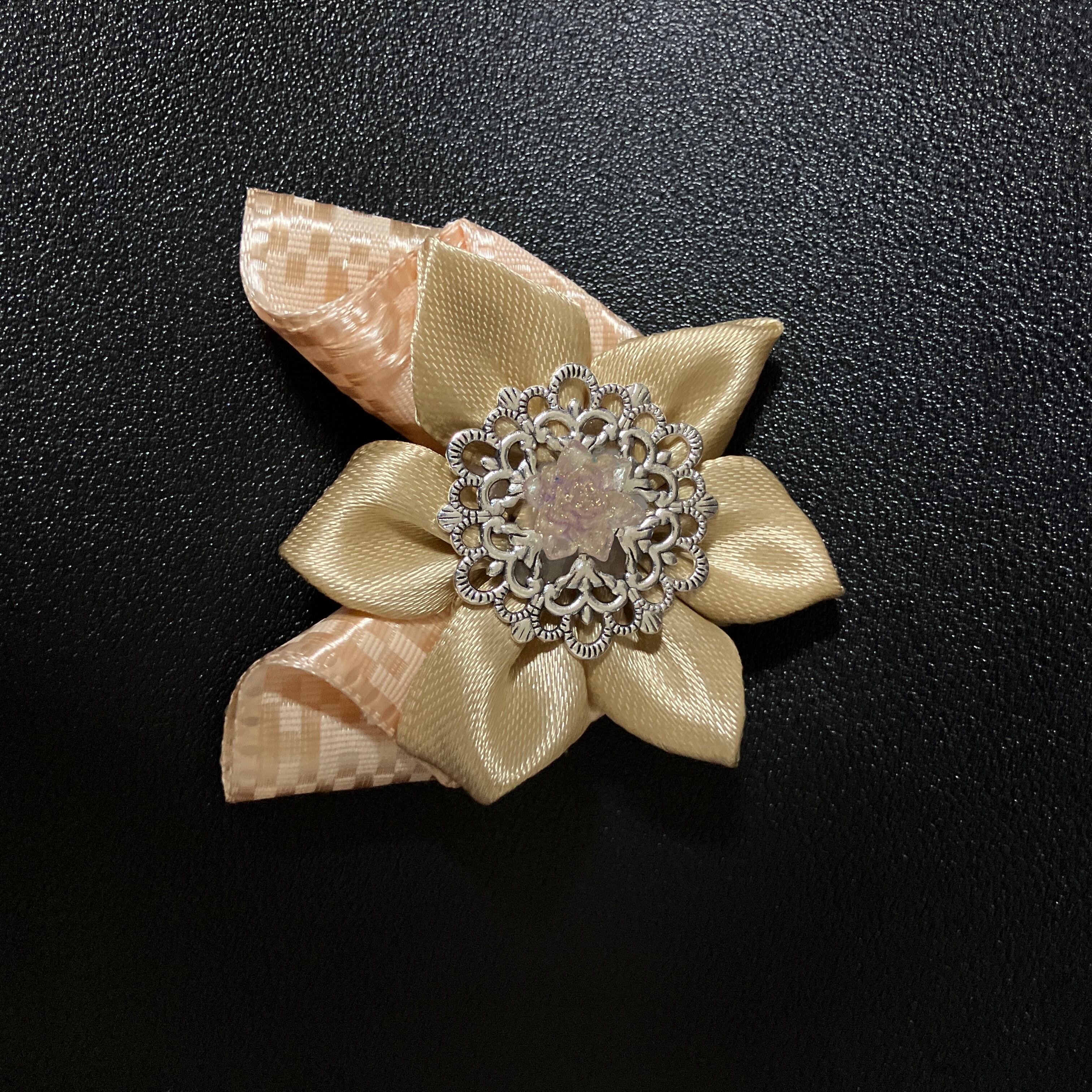 ・落ち着いたカフェラテカラーのリボンに、絶妙なニュアンスのアッシュクリームを重ね、中央にはきらりと光るモチーフをあしらいました。