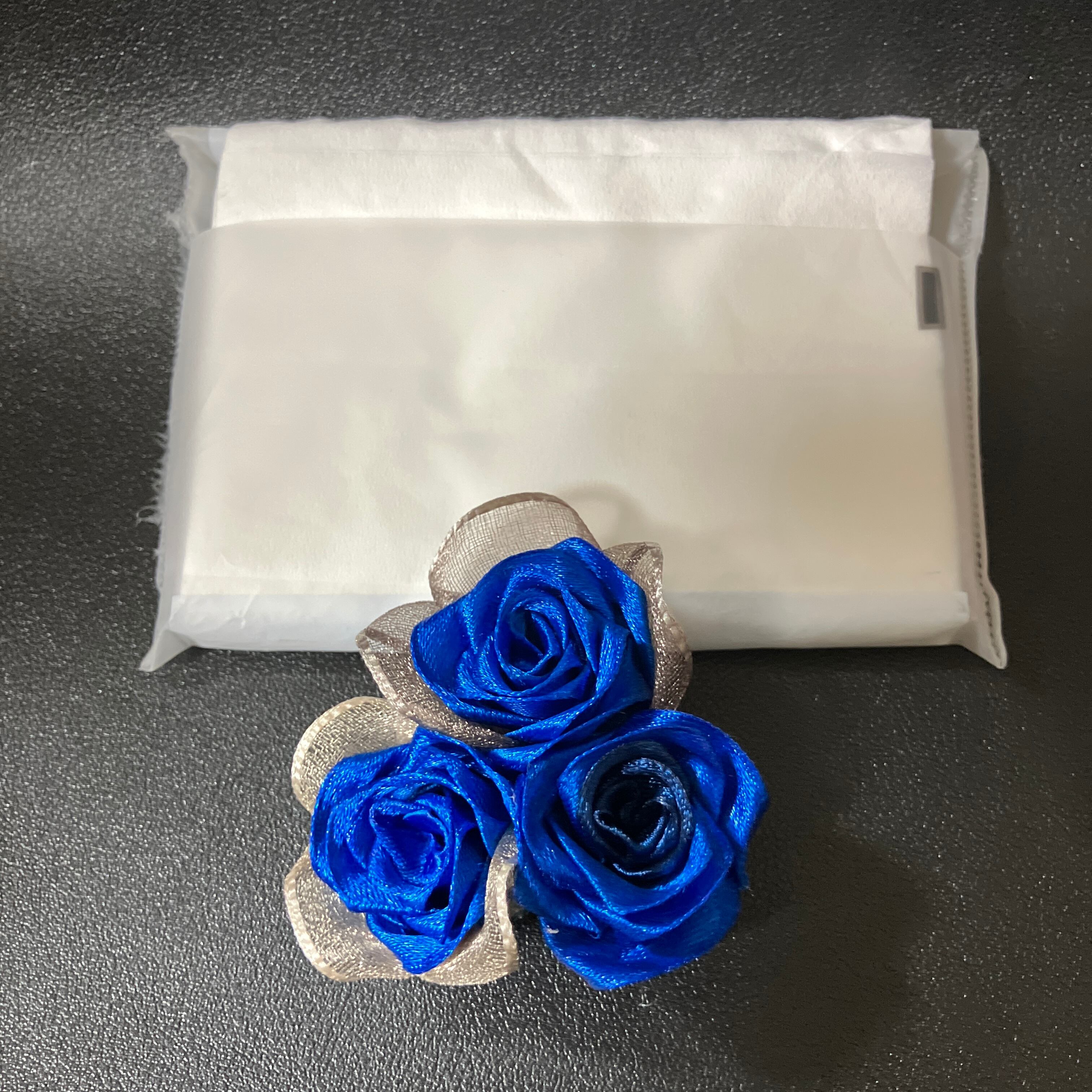 深く鮮やかなアクアブルーのリボンを一輪ずつ丁寧に組み上げ、三輪のブーケに仕立てた「ノーブル・ヴィオラ」。