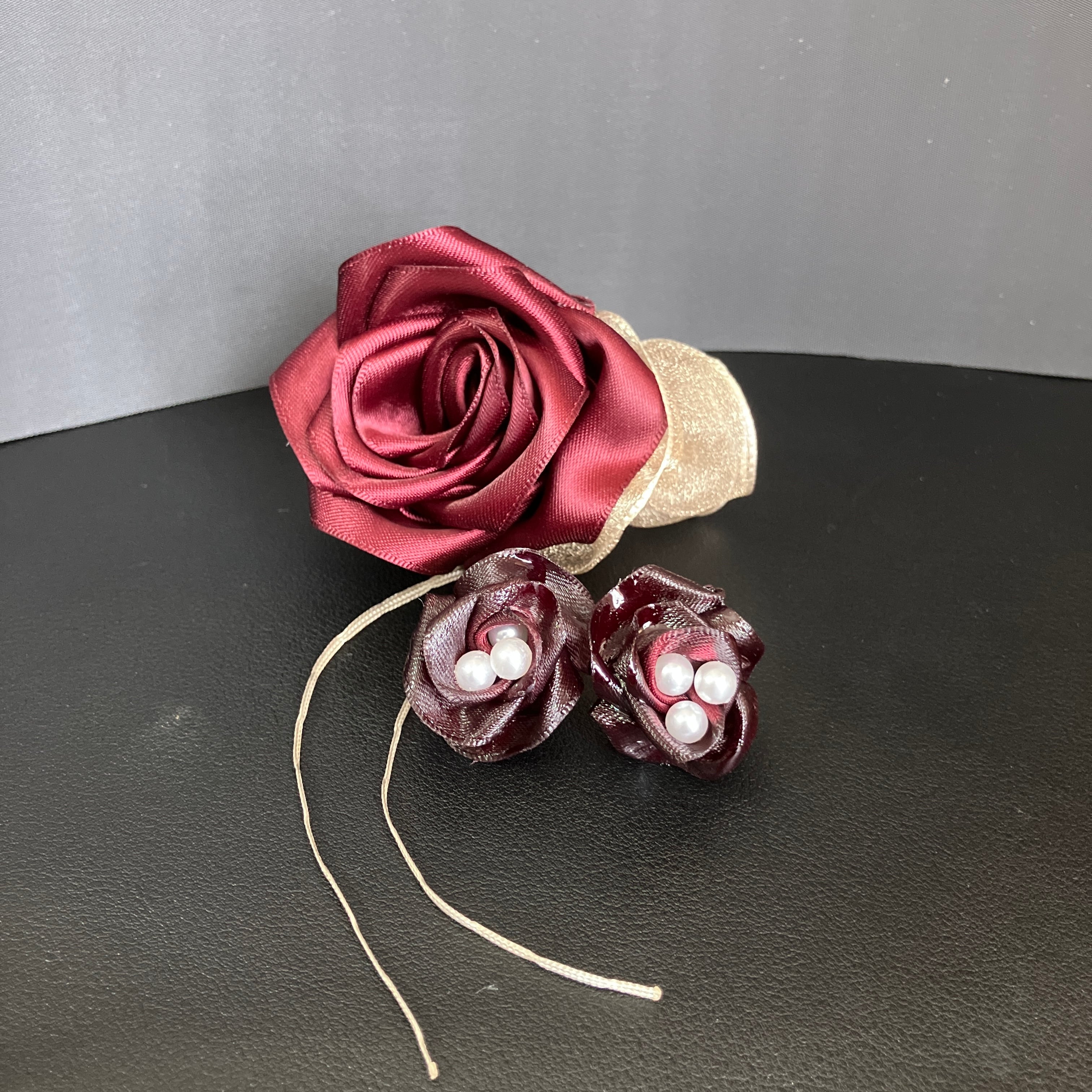 深いワインレッド(バーガンディ)のサテンリボンを贅沢に使用した、コサージュとイヤリングのセット商品です。